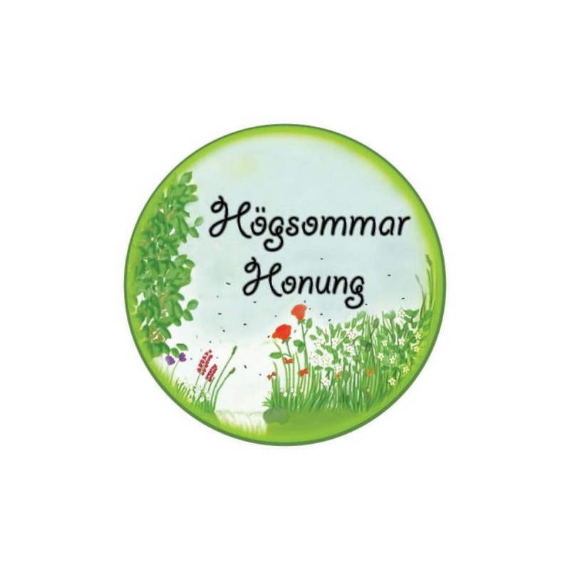 Självhäftande etikett med diameter 38mm, med texten "Högsommar honung"