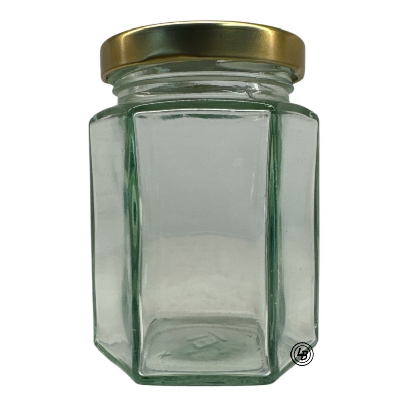 Denna sexkantiga glasburk rymmer 250 gr (196 ml) och levereras med 58 mm guldfärgade skruvlock. (OBS: Viktangivelsen avser honung.)