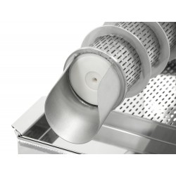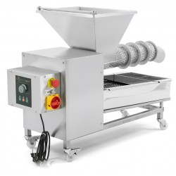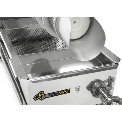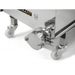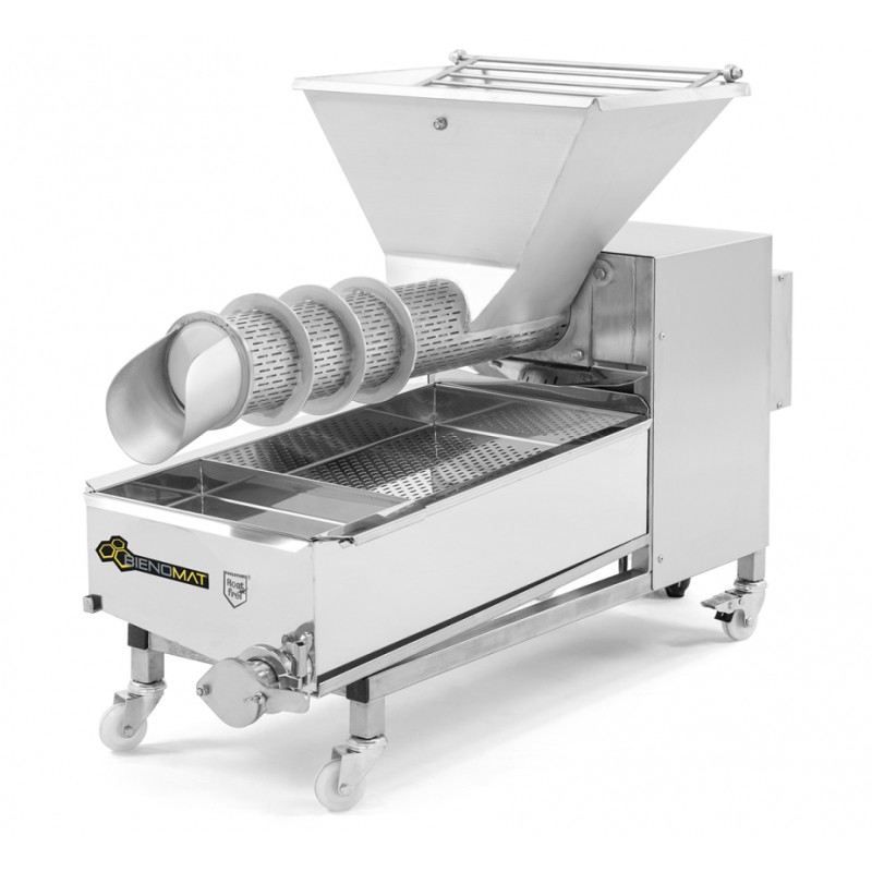 Mobil skruvpress i rostfritt stål förseparering och pressning av avtäckningsvax, kakhonung ller ljunghonung. Utrustad med fyra hjul, varav två är låsbara, samt uppsamlingsbricka med löstagbar dubbelsil.