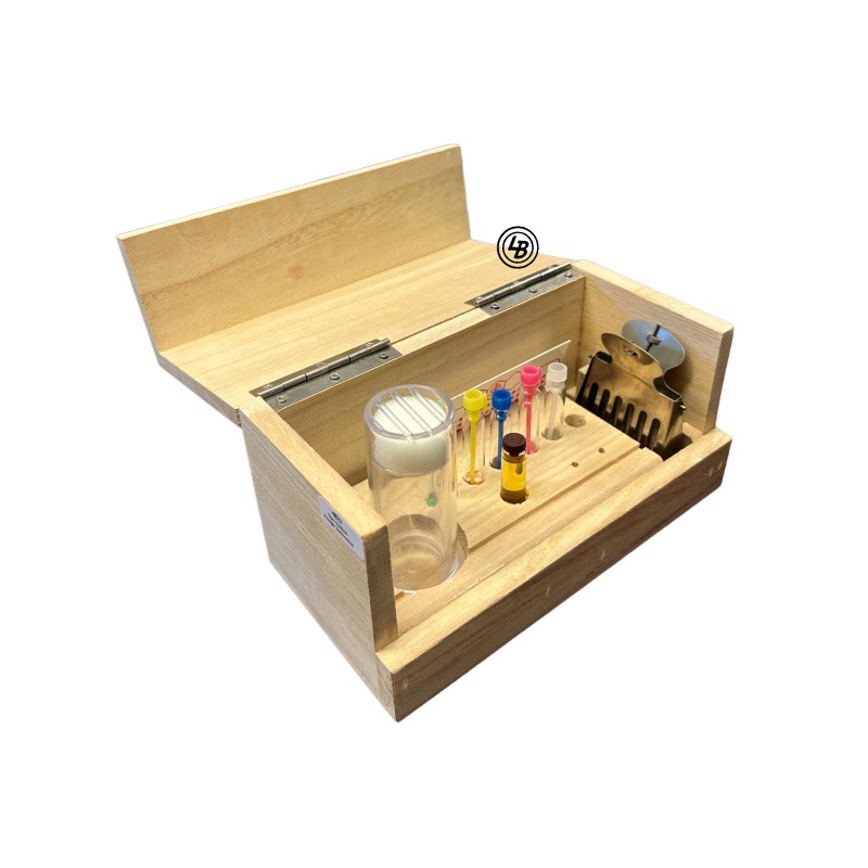 Tillverkad av trä, för att rymma olika redskap för att märka drottningar, såsom märkbur, drottningklämma, märkbrickor och lim.