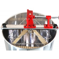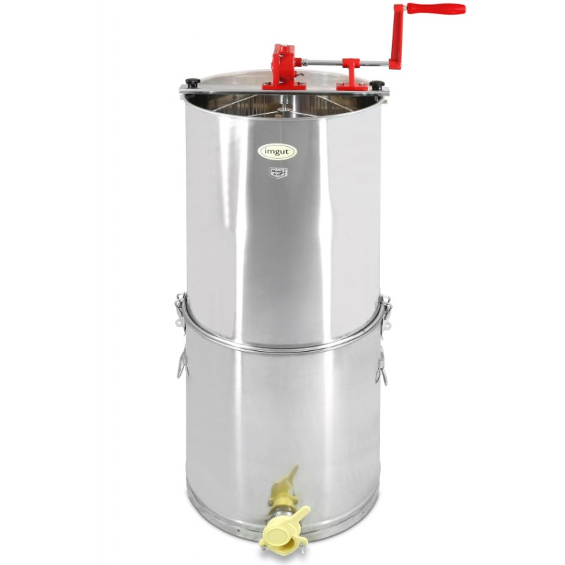 Kompakt manuell tangentialslunga i rostfritt stål med integrerat system för honungsavtappning. Den medföljande 50-kgs kärlet fungerar både som sil och uppsamlare – honungen rinner direkt genom ett grovsil från slungan till behållaren.