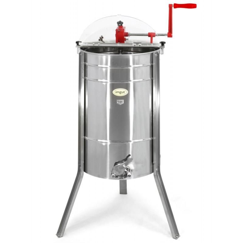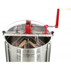 Robust honungsslunga i rostfritt stål med sidomonterad handvev, frihjul och broms. Utrustad med tangentiell korg för tre ramar upp till 245 mm i höjd – passar t.ex. Lågnormal och Langstroth.